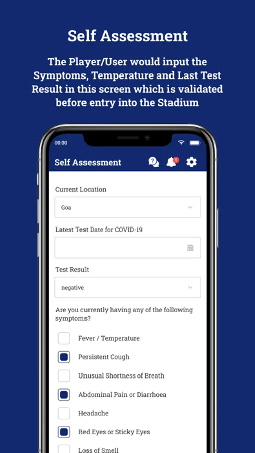 The ‘Self Assessment’ section helps the user to fill in the symptoms provided as below to generate the Access Status of the user which will be validated during the entry into the Stadium and notifies the Team Manager and Team Doctors in case of ‘No Access’ status.