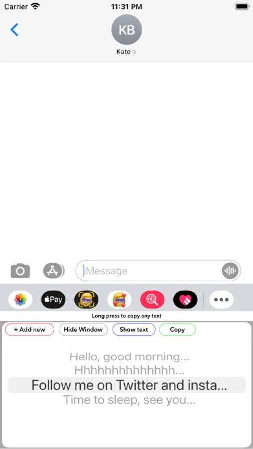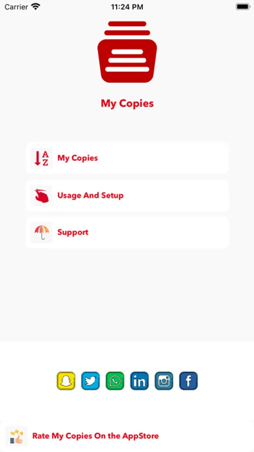 My Copies App allows you to add words and phrases that can be accessed via your keyboard directly through any application on your device such as; Twitter, Facebook, Messages, WhatsApp, Snapchat, and so on.