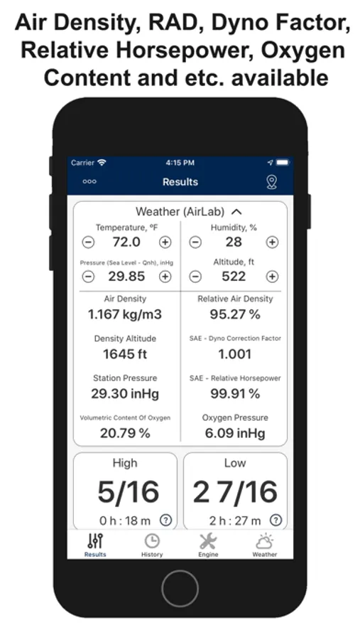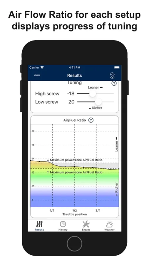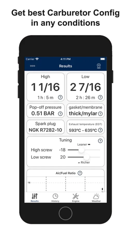 • Results: In this tab high speed screw position, low speed screw position, pop-off pressure, gasket & membrane reccomendation, spark plug, optimal exhaust temperature (EGT) are shown. These data are calculated depending on the weather conditions and the engine configuration given in the next tabs. This tab lets do a fine tuning adjustment for all this values to adapt to the concrete engine. Also the air density, density altitude, relative air density, SAE - dyno correction factor, station pressure, SAE- relative horsepower, volumetric content of oxygen, oxygen pressure are shown too. On this tab, you can also share your settings with your colleagues. You can also see in a graphic form the calculated ratio of air and fuel (lambda).