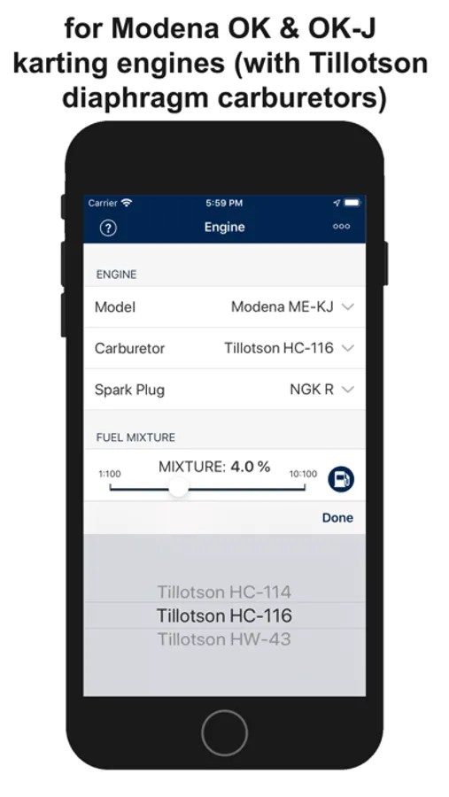 This app provides, using temperature, altitude, humidity, atmospheric pressure and your engine configuration, a recommendation about optimal carburetor config (jetting) for karts with Modena OK & OK-Junior engines (ME-K and ME-KJ models) which use a Tillotson diaphragm carburetors
