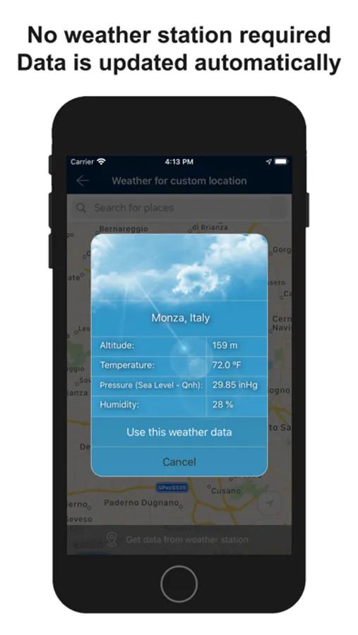 This app can obtain automatically the position and altitude to get the temperature, pressure and humidity from the nearest weather station through the internet. Internal barometer is used on supported devices for better precision. Application can run without GPS, WiFi and internet, in this case the user has to enter weather data manually.