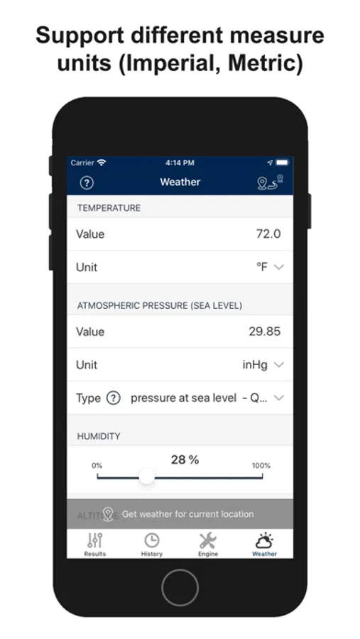 • Weather: In this tab, you can set the values for current temperature, pressure, altitude and humidity. Also this tab allows to use the GPS to get the current position and altitude, and connect to an external service (you can choose one weather data source from several possible) to get the weather conditions of the nearest weather station (temperature, pressure and humidity). In addition, this application can work with a pressure sensor built into the iPhone. You can see if it is available on your device and turn it on or off. Also, on this tab, you can enable alerts about possible carburetor icing.