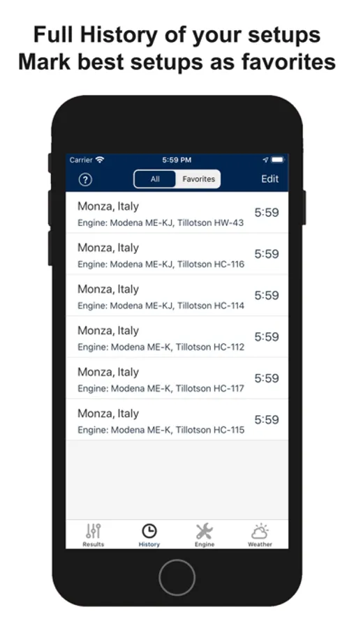 • History: This tab contains the history of all carburetor configs. This tab also contains your favorite carburetor configs.