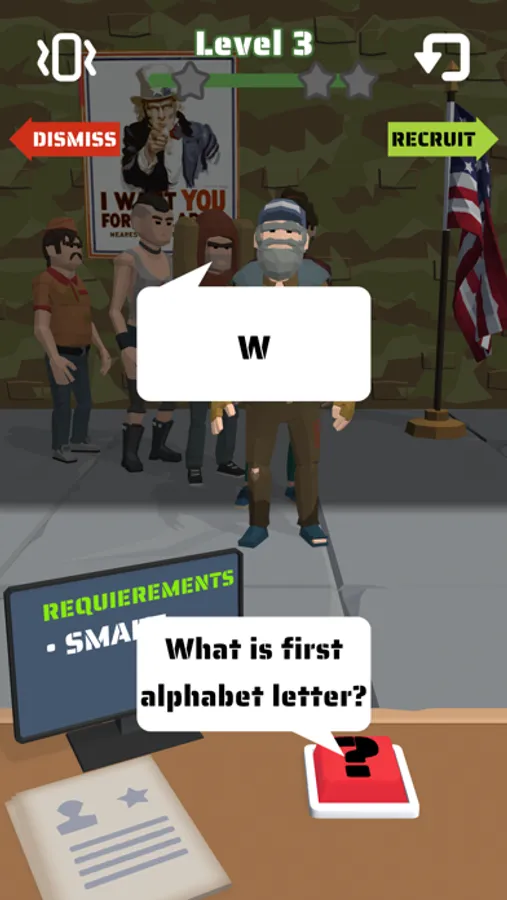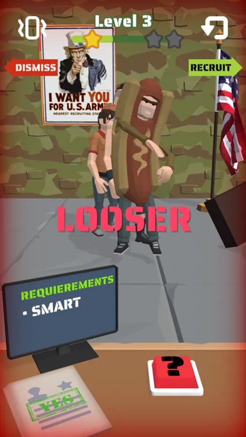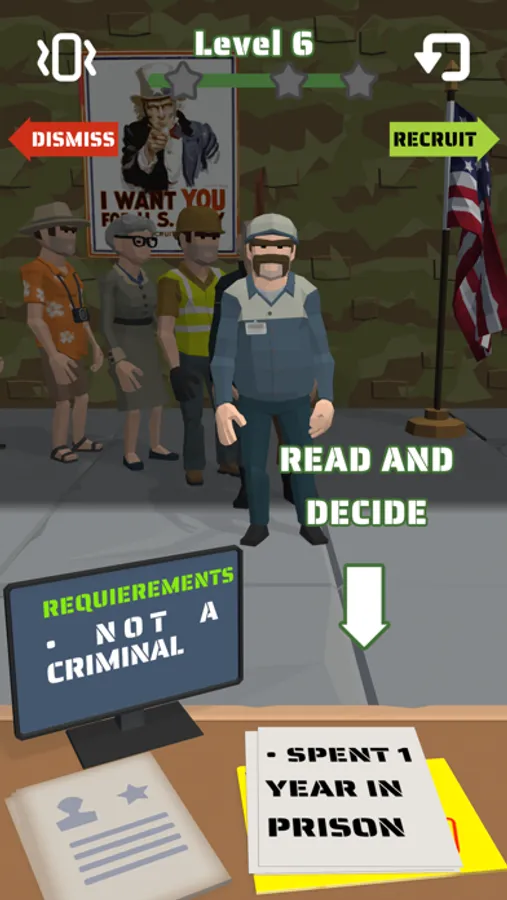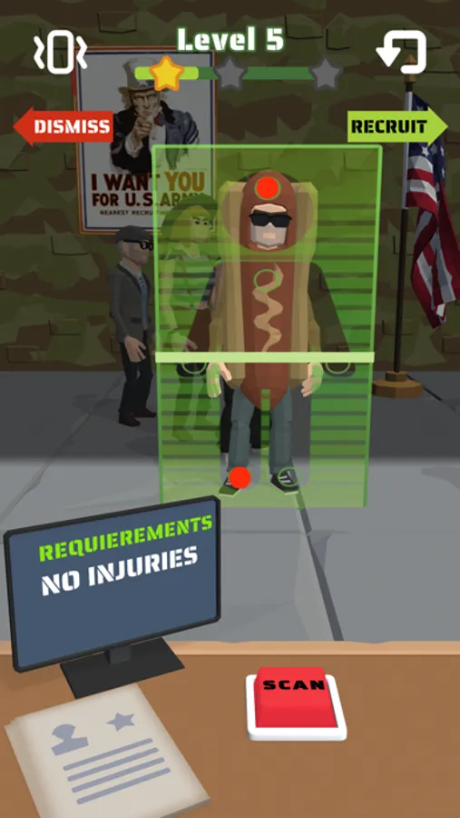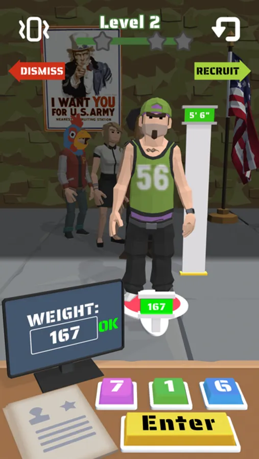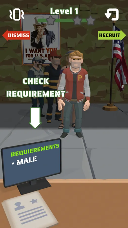 Army needs soldiers! Become an army recruiter! See if recruit meets requirements. Too low? Refuse! Too dumb? Refuse! Too educated? Refuse!