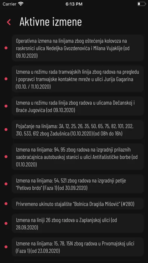 - izmene na linijama - spisak aktuelnih izmena na svim linijama, sa linkom do detalja izmene