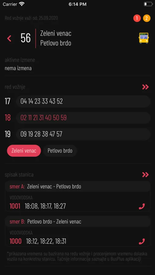 - omiljene stanice - u detaljima linije moguće je odabrati omiljene ili najčešće korišćene stanice. Za svaku odabranu stanicu prikazuju se tri naredna procenjena vremena dolaska vozila na datu stanicu. Vreme dolaska se procenjuje na osnovu vremena polaska sa početne i vremena potrebnog da dođe do date stanice