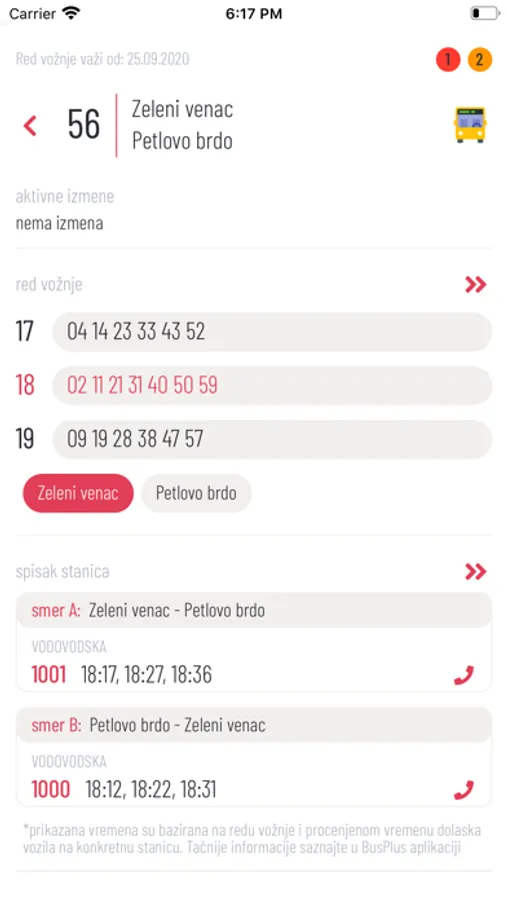 - spisak stanica sa kodovima - za svaku liniju se prikazuje spisak stanica sa kodovima, odvojeno za oba smera