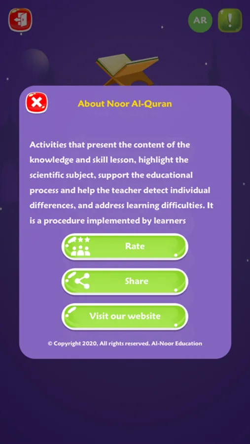 Noor Al-Qur'an App supports the Qur'an Al-Kareem and Al-Hadith Ash-Shareef curriculum of the United Arab Emirates. The app contains memorization and recitation audio as well as activities related to Qur'an and Hadith sciences. Our content was designed in accordance with the Bloom's Taxonomy educational framework which enhances teachers ability to help learners in gaining skills at every level by sending appropriate homework that corresponds to each level of Bloom's Taxonomy.