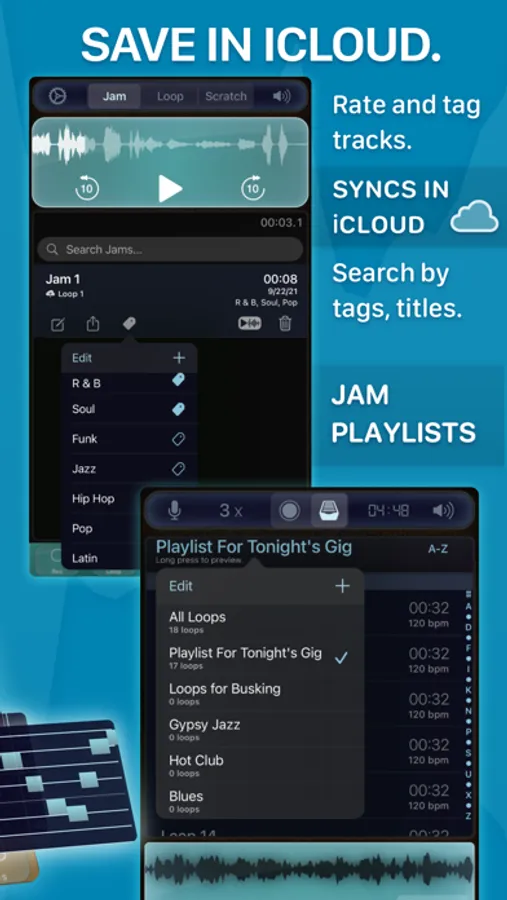 • Full MixDown in App - Create a full mix down using a Jam File together with a Loop File and export in MP3, WAV, or Apple Lossless