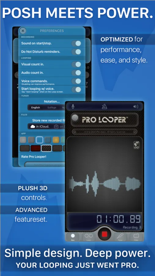 • OneTouch Looping - Loop in perfect time by entering in your loop length and pressing record... Pro Looper will then calculate the perfect loop length and keep you right in tempo so there's never a "blip" or "glitch" or "hiccup" when you loop around... You will only ever have butter-smooth loopback.