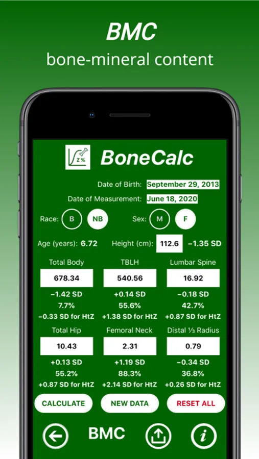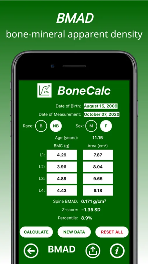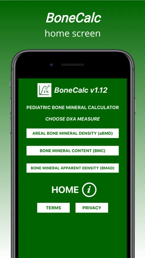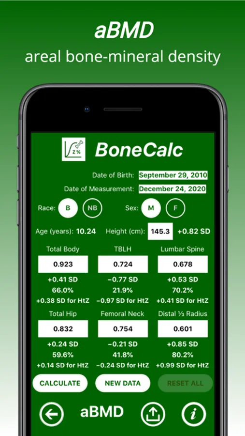This app is designed for the calculation of Z-scores and percentiles for bone mineral content (BMC) and areal bone mineral density (aBMD) for children ages 5–20 years, as measured by dual-energy X-ray absorptiometry (DXA), for the following sites: total body, total-body-less-head, lumbar spine, total hip, femoral neck, and distal ⅓ radius. Separate calculations are available by age, by sex, and by race (Black and non-Black). Height-Z–adjusted Z-scores for these measures are also calculated. The BMC and aBMD data are derived from the CHOP Bone Mineral Density in Childhood Study [Zemel B et al., J Clin Endocrinol Metab 2011;96(10):3160–3169]. Calculations are also available for lumbar-spine bone mineral apparent density (BMAD) for the spine [Kindler JM et al. J Clin Endocrinol Metab 2019;104(4):1283–1292].