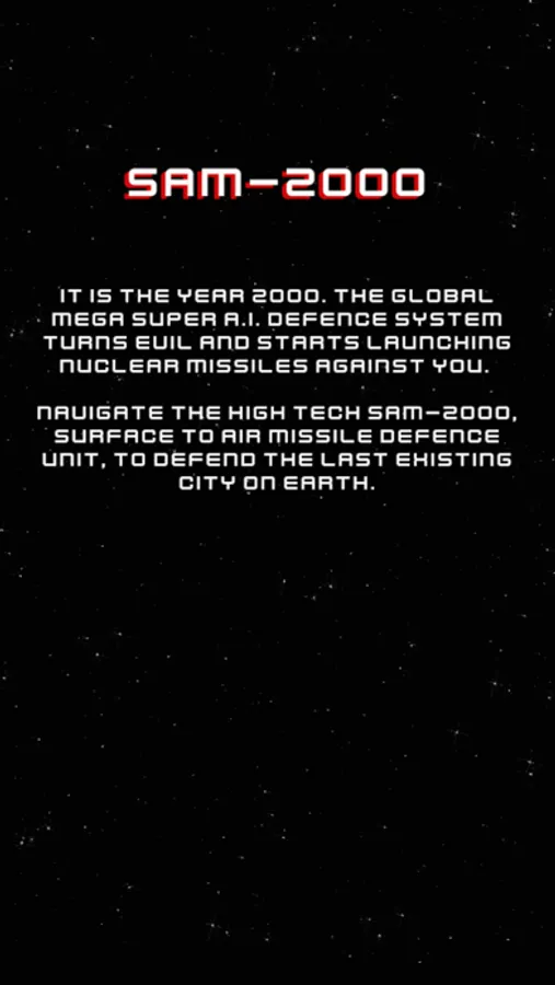 Navigate the high tech SAM-2000, Surface to Air Missile defence unit, to defend the last existing city on earth.