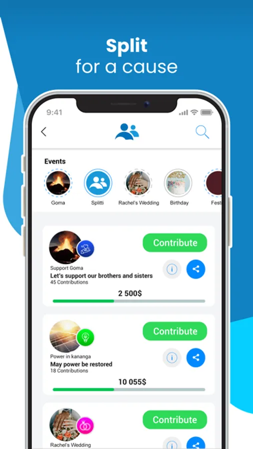 Splitti allows you to contribute for your loved ones or causes. With Splitti, easily create a group and collect money with friends to celebrate a birthday or wedding, participate in a baby shower, organize a leaving-do party, help a close one through grief, split payments, etc.