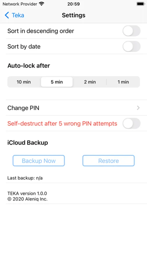 Please note that if you enable self-destruct mode and do not have iCloud backup, you will lose all notes irreversibly if self-destruct sequence is initiated. If you do have iCloud backup, you will need to remove the app, reinstall from the App Store, set the same PIN then restore from the backup.