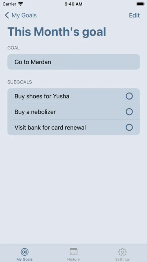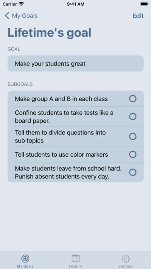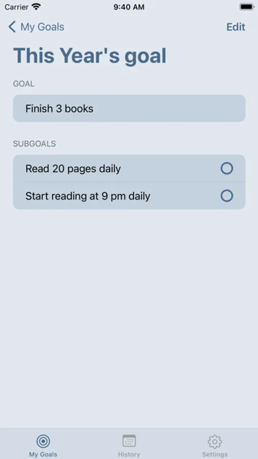 This app lets you achieve your goals more effectively by focusing on the main things especially. It removes the burdens of various dates and times while recording your goals and makes the process of goal scheduling and achieving very simple. It will remind you about your goals two times daily which you choose yourself.