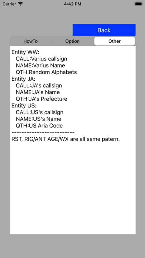 You can select various information from CALL, RST, Name, QTH, Rig/Ant and Age/WX by random.
