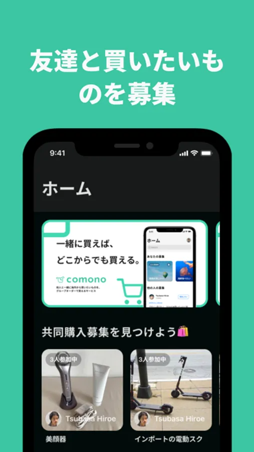 comono(コモノ)は友達や知らない人と、安心安全な共同購入、所有体験を提供するグループシェアリングサービスです。共同所有したい商品の出品、購入のマッチング、取りまとめ、決済までを一括で行うことができます。