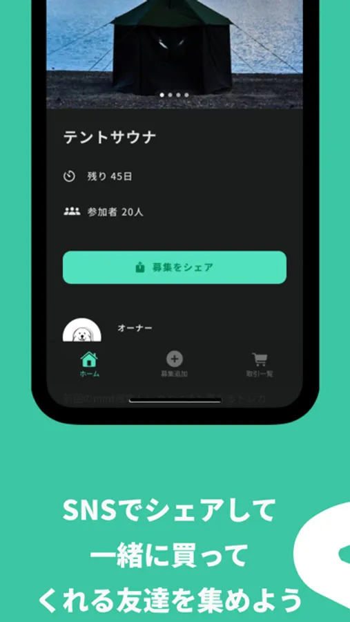募集を作成し、その中にこの募集で扱う商品を登録し、SNSにシェアします。募集は1人でも購入する方が出た場合は成立して料金の請求が行われます。