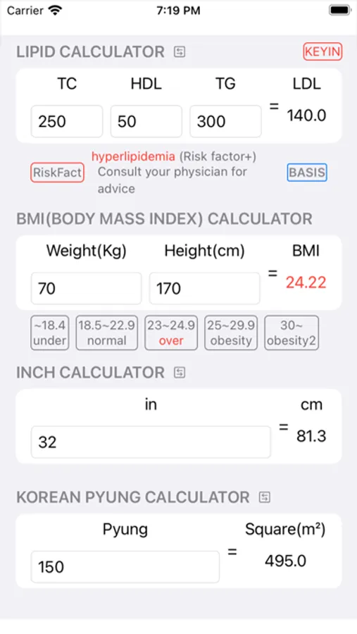 Calculator for dyslipidemia, BMI(Body Mass Index), Inch, Centi