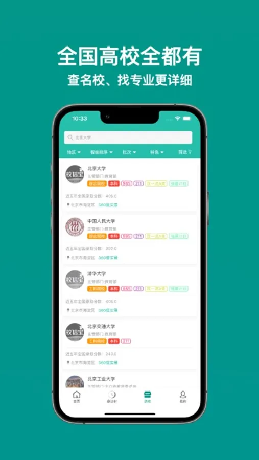 1、高校大全,可以查询全国所有学校包括高校、高考明校,能够获取到全新的资讯、历年的招生信息、录取分数、师资力量、学校专业、就业前景信息等。
