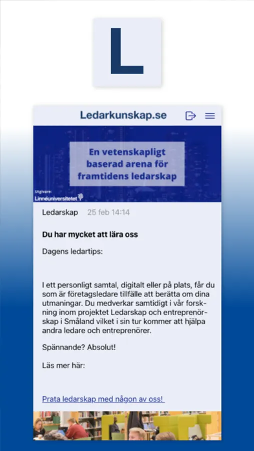 Här hittar du handfasta och konkreta tips, nyttigheter och inspiration för ditt ledarskap, baserade på erfarenheter från forskning och projekt inom Centrum för ledarskap i Småland, vid Linnéuniversitetet.