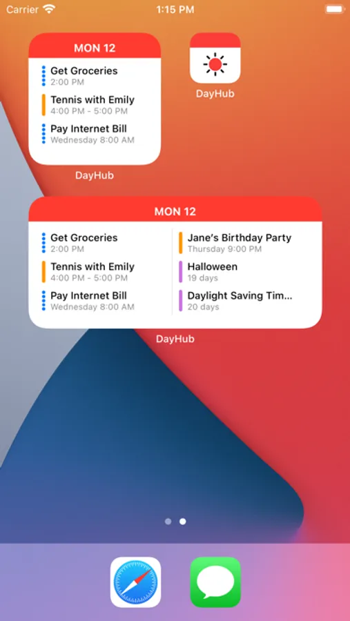 Save space on your home screen by using the DayHub widget to see today's date, upcoming events, and reminders all in one place. The widget shows future events so you'll never have a label that says "No events today" take up 4 spots on your home screen.