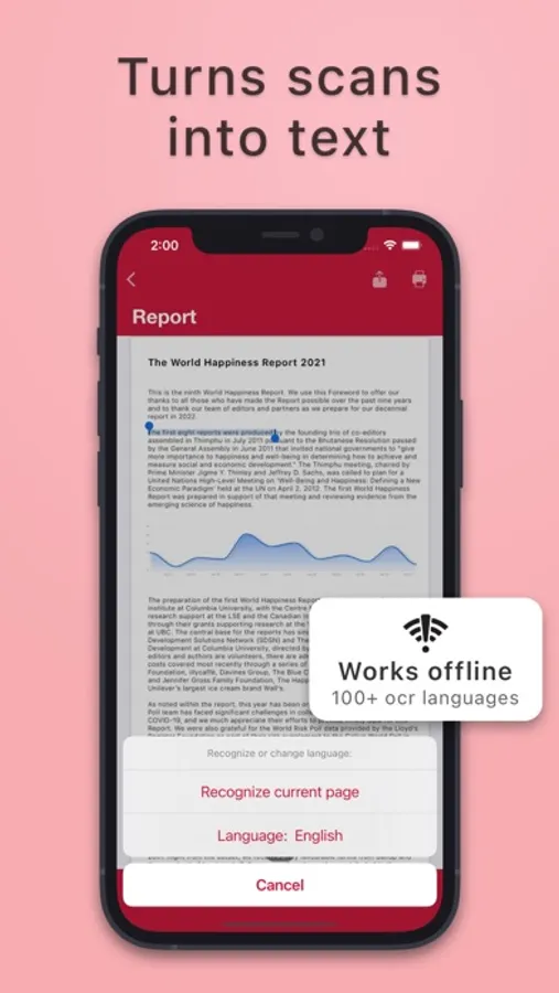 OCR (optical character recognition) feature recognizes texts in document images and extract them from images for later searching, editing or sharing.