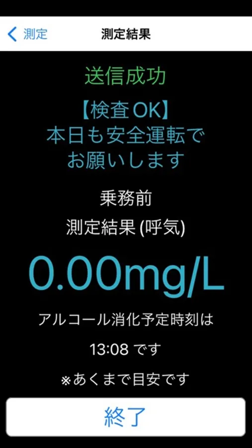 測定だけでなく、測定時にアルコール反応があった場合、アルコールが消化されるまでのおよその目安時間も表示され、危険な酒気帯び運転の防止や、安全で正確な運行に役立ちます。