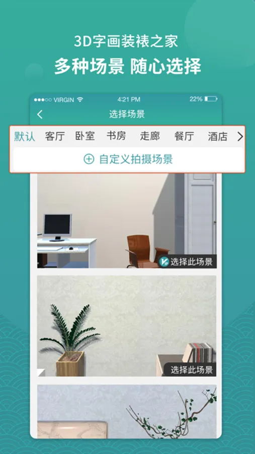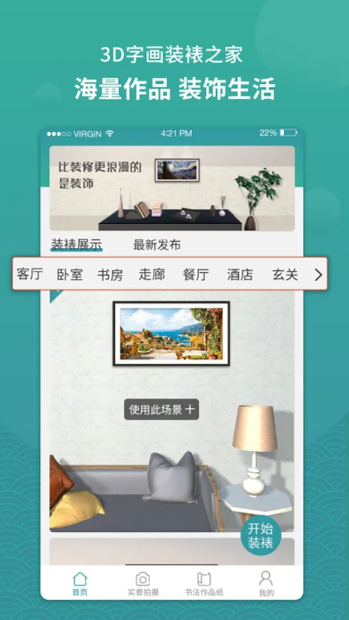 【我要装裱】 系统提供了几十种精美的装裱类型可供选择,上百种风格的房屋场景可供模拟体验,包括但不限于客厅、餐厅、走廊、卧室、酒店等,同时还提供不同的装饰风格进行搭配选择,如: 现代风、欧美风、地中海等。3D字画装裱之家还采用了3D模拟技术,让你身临其境的感受装饰装裱视觉效果。