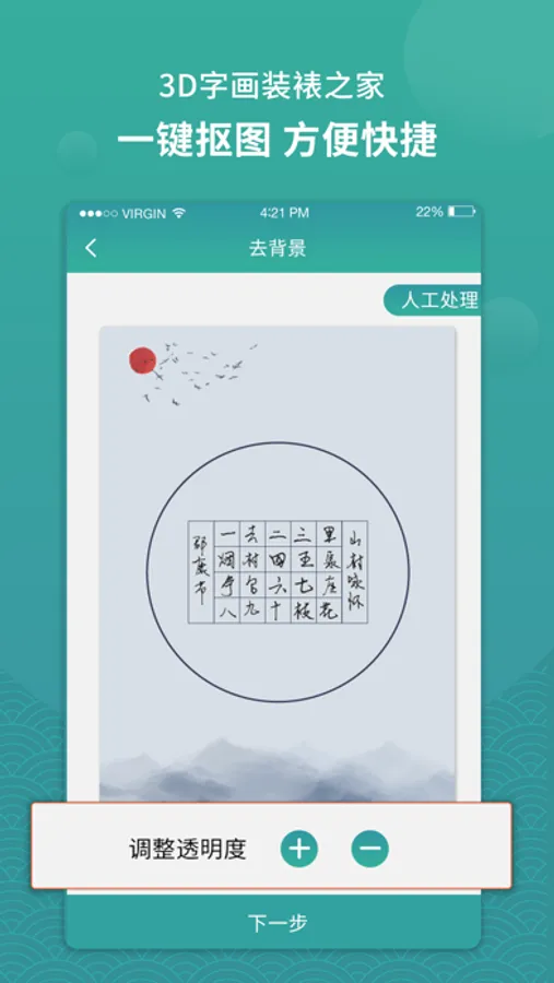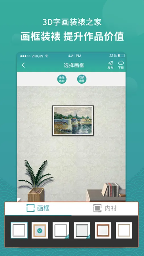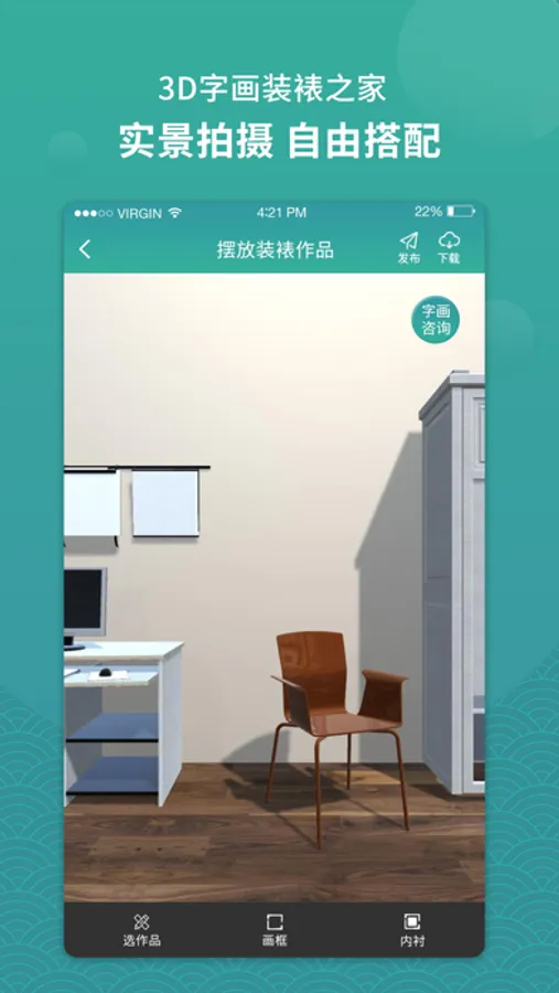 【自主设计】 DIY手工设计功能,巧妙地分类场景和书画作品,您可选择自主上传需要装饰布局的场景图片,再选择由我们系统为您提供的精美书画作品,系统还为您实现了两联画和三联画装裱功能,让您时刻体验字画、场景搭配美感;您亦可上传自己创作的书法字画作品,再筛选您喜欢的场景、画框、卡纸类型,实现最佳的书画装裱效果,对于自己满意的作品可以发布到平台供其它用户参考学习也可下载保存到手机相册。