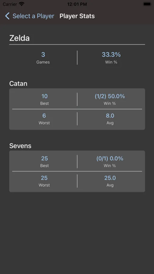 - See individual statistics (Best score, worst score, win percentage, average score)