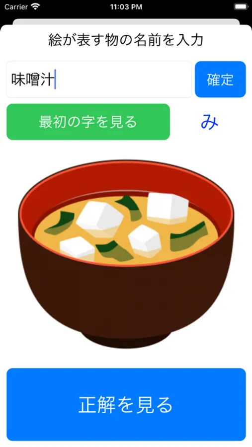 表示された絵を表す単語を想起し文字で入力すると、正誤および正解例が文字と音声で返されます。入力しなくても正答が確認できます。ヒントとして最初の文字が表示されます。