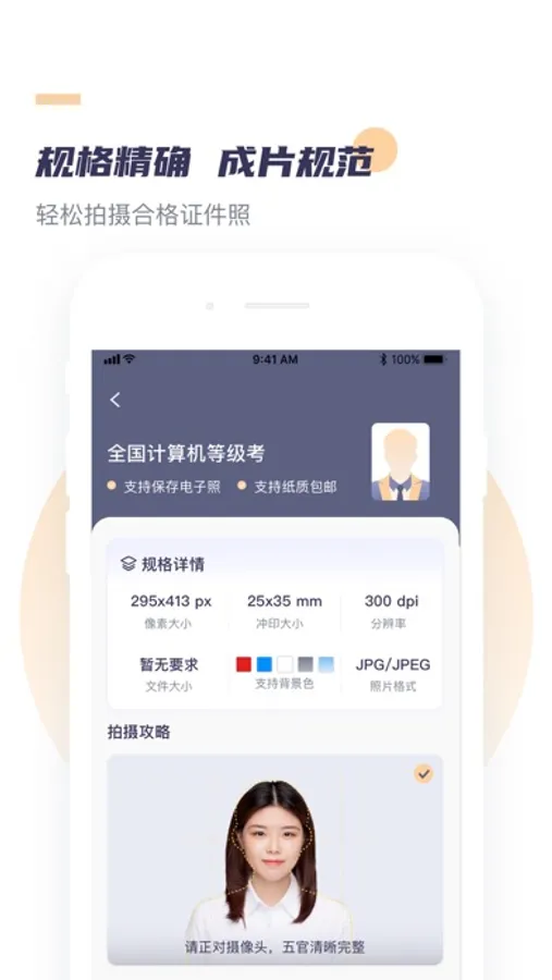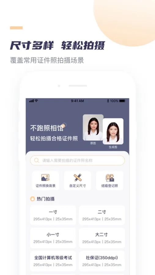 精准满足您需要的每一个证件照的像素尺寸,分辨率和文件大小,确保证件照合格规范;支持自定义尺寸,想拍多大就拍多大