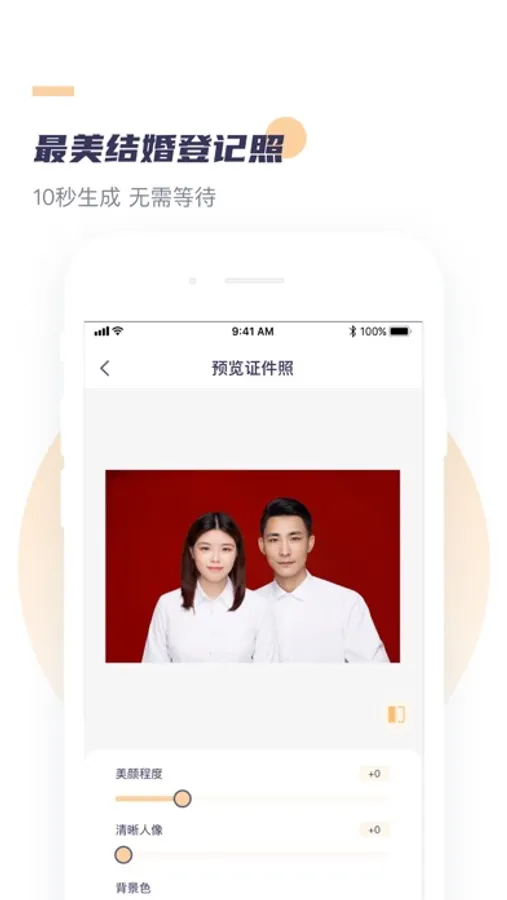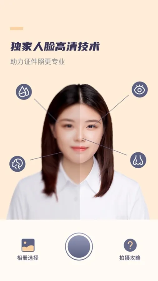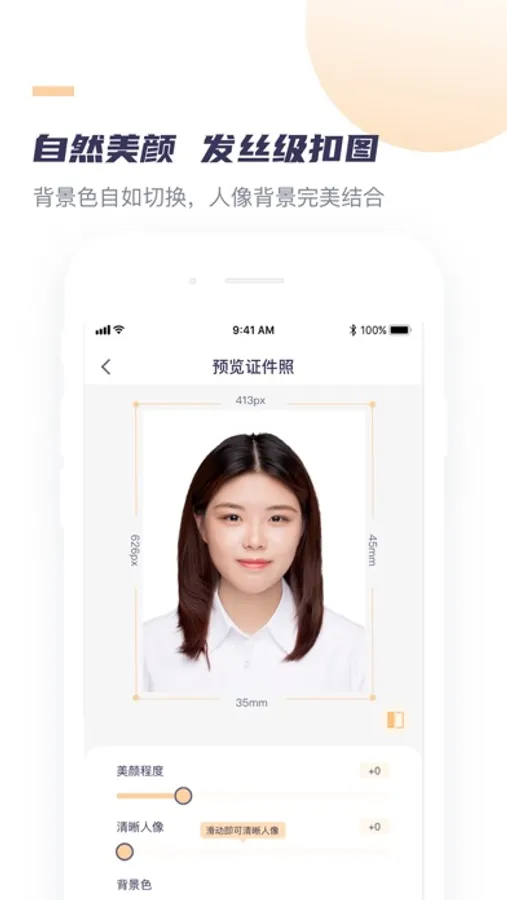 独家人脸高清技术,确保你的证件照高清又合格;一键设置美颜等级,AI自然美肤美颜,给你好看合格证件照。多种背景色随意切换,融合自然。抠图精准到发丝,人像与背景色完美贴合。