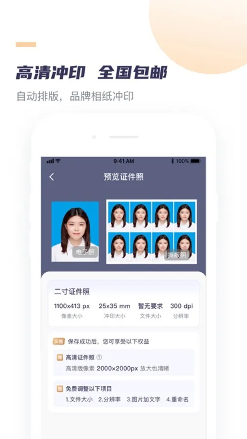 自动生成排版照,品牌相纸、相机专业打印,寄出前裁剪好发送给您。全国包邮,对证件照有紧急需求的,可以选择顺丰加急寄出,快速响应