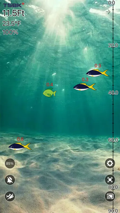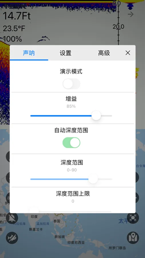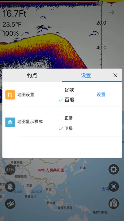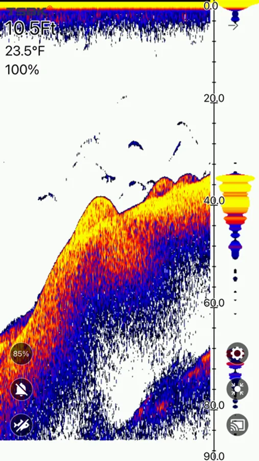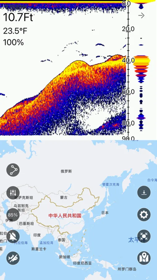FR9000探鱼器配套app拥有全球独家智能双显示技术,可以同时显示声呐的真实回波波形和人工智能自动回波识别后的鱼群信息和大小鱼信息,以及水底结构和水底地形信息。