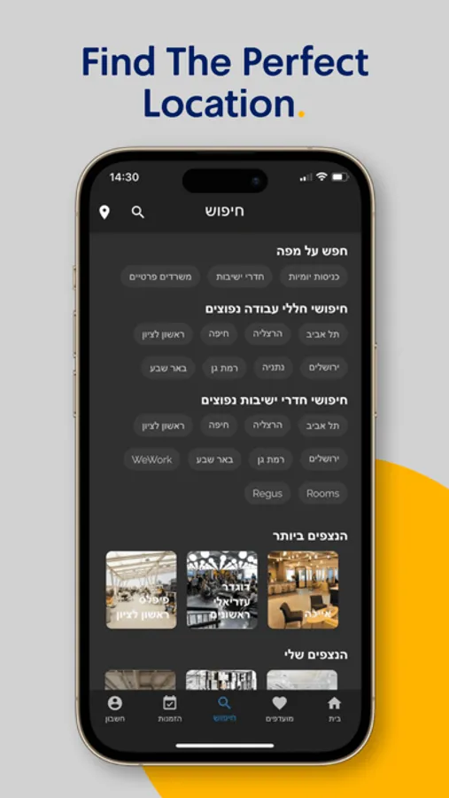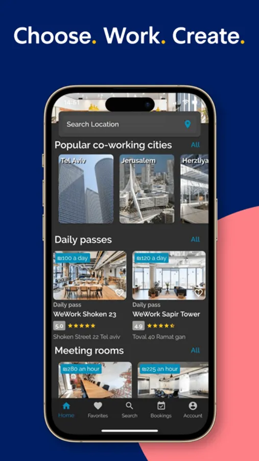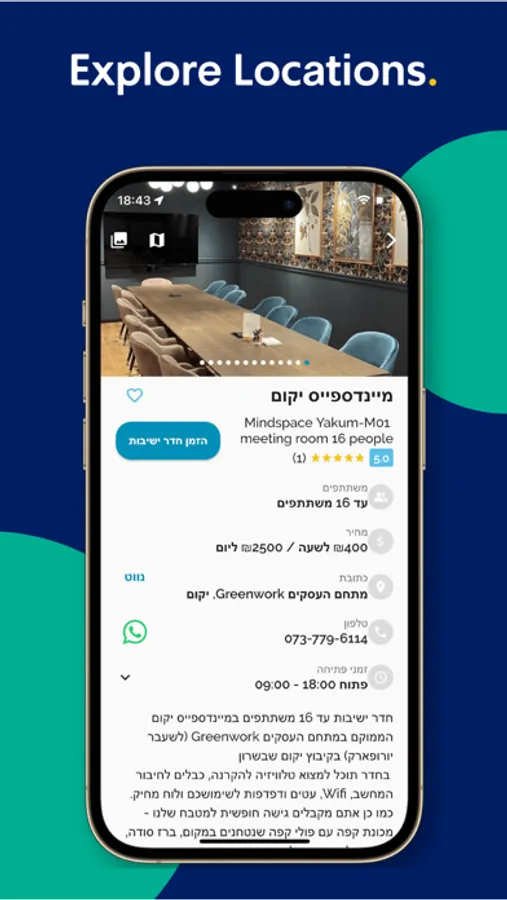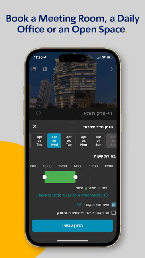 באמצעות האפליקציה תוכלו להשכיר משרד לפי שעה או לפי יום, לשכור משרד יומי או חלל עבודה משותף וכן לתאם פגישות בחדר ישיבות להשכרה.