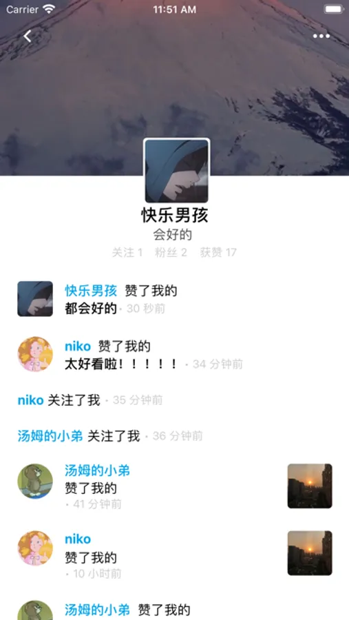 3. 通知:提醒谁关注了你,谁给你点赞了,希望给你带来愉悦的心情