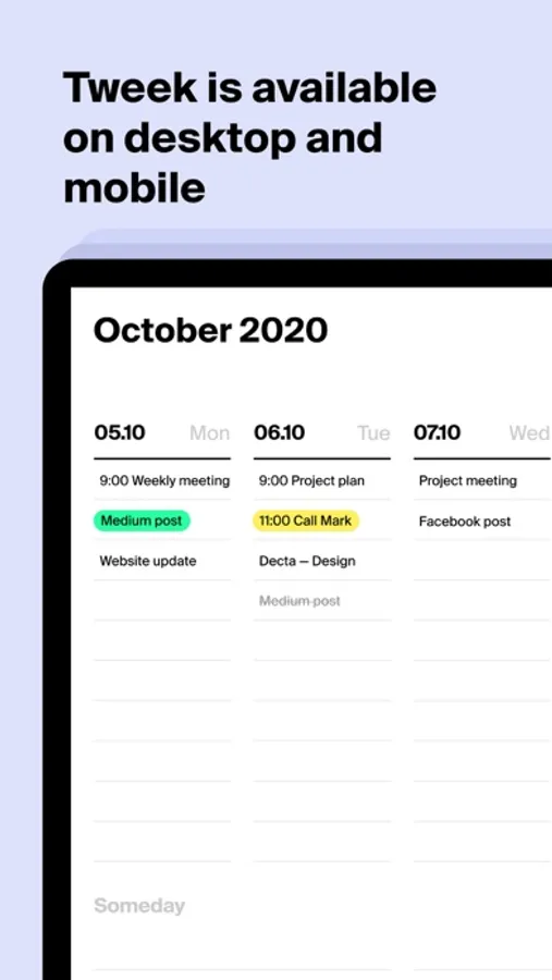 Tweek is a very simple weekly cute planner with minimalist & aesthetic clear design like a paper planner. Intuitive simply organize your tasks, reminders and collaborate on them with your team or family.