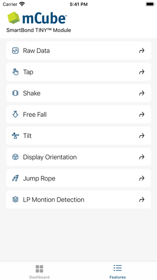 The SmartBond TINY module is a 3-axis accelerometer sensor module with wireless connectivity. It provides sensor data and some algorithm results, such as: Tap, Shake, Free Fall, Tilt, Display Orientation, Jump Rope, Low-Power motion detection.