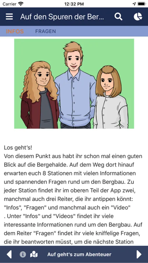 Die App führt euch auf einem Erlebnispfad um und über die Bergehalde Monte Barbara im saarländischen Bexbach. An mehreren Stationen erfahrt ihr mit Hilfe von Texten, Videos und Bildern viel Wissenswertes über die Arbeit und das Leben der Bergleute in früherer Zeit.