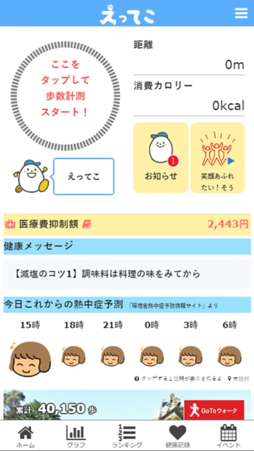歩数の計測表示はもちろん、歩行距離、消費カロリーも表示。さらに、歩くことによる医療費の削減効果を「医療費抑制額」として算出し表示することができます。