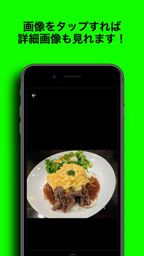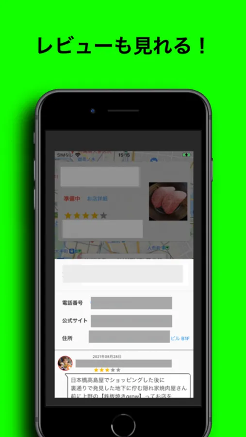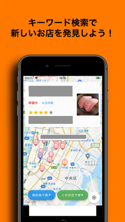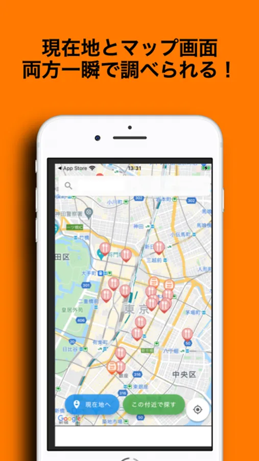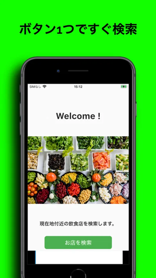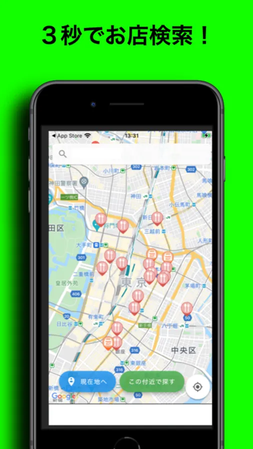 不要な機能を排除し、極限までシンプルなUIで誰もが使いやすく、現在地付近のお店を調べられます。