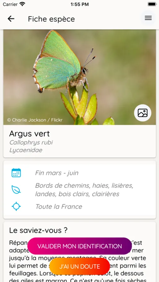 Le contenu de cette application est tiré du guide Papillons des jardins, des prairies et des champs, co-écrit par Noé et le Muséum national d’Histoire naturelle.