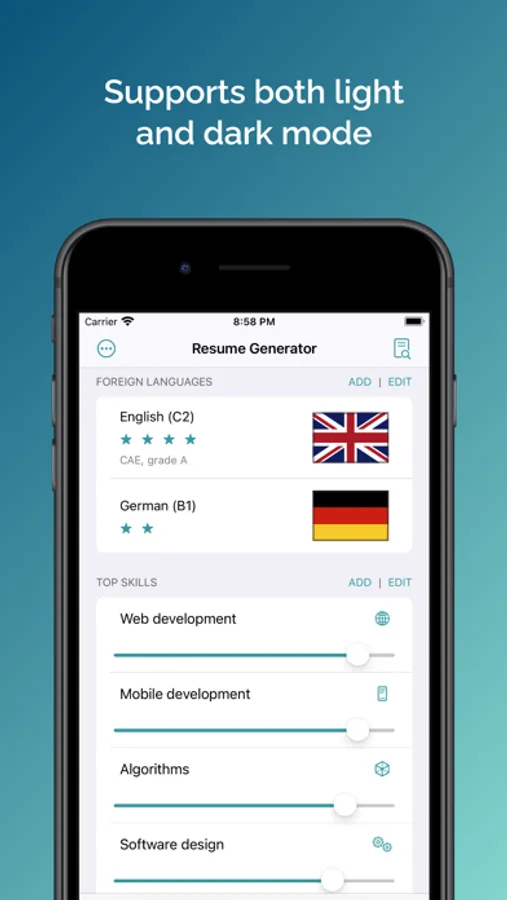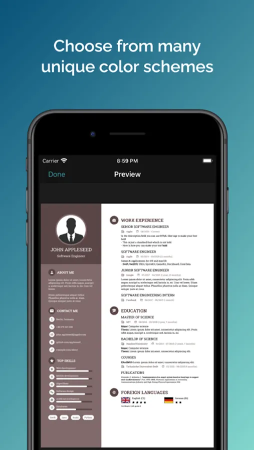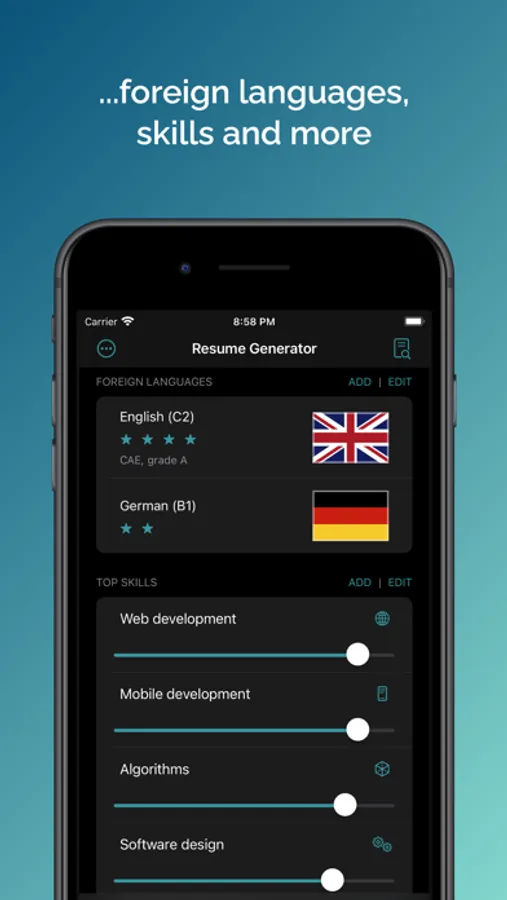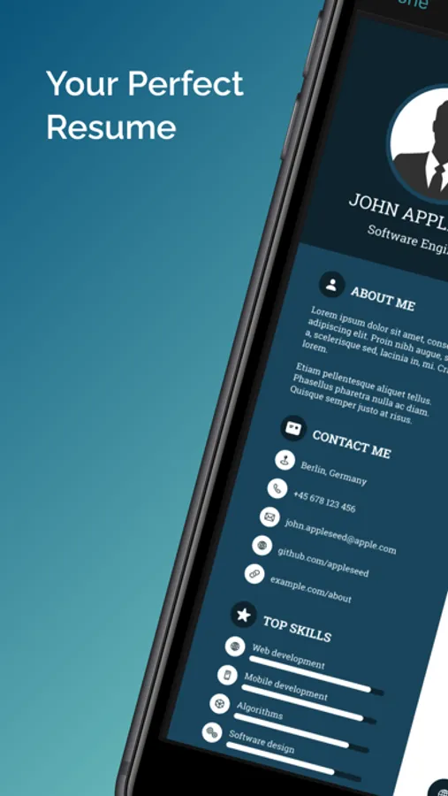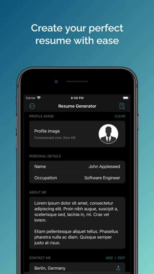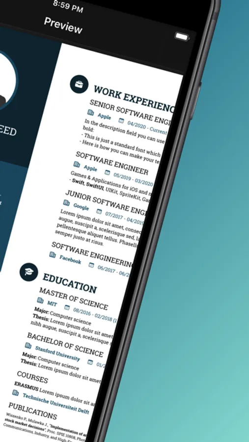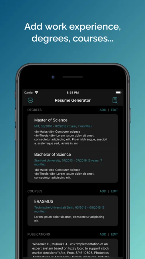 Create your Perfect Resume - add your personal details, contact information, work experience, degrees, courses, publications, skills, foreign languages and more...!