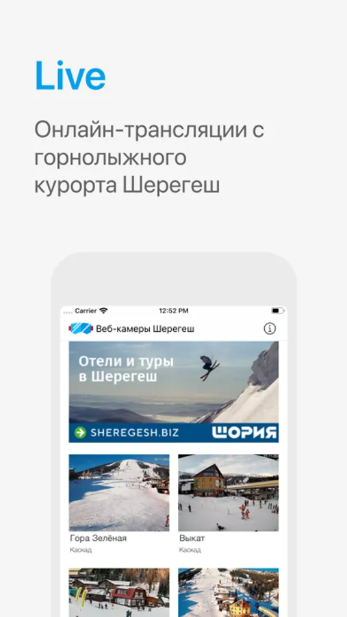 В приложении в режиме онлайн представлены ключевые точки горнолыжного курорта Шерегеш: трассы, станции подъемников, отельный городок. Вы сможете в реальном времени оценить снежный покров, количество посетителей, очереди на канатные дороги, погоду у подножья и на вершинах гор (да, она может существенно отличаться).