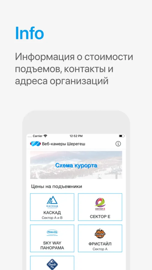 Помимо онлайн-съемки мы включили в приложение стоимость подъемников и ski-pass в текущем сезоне и описание ключевых трасс и подъемников, чтобы вам было проще выбрать локацию для отдыха.