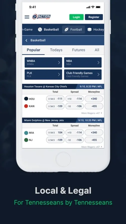 Action 24/7 Sportsbook App is here. The first Sportsbook app made By Tennesseans For Tennesseans. Easy registration, Simple deposits, Same Day withdrawals, and all the sports betting Action you can handle. We're not a mega-corporation from some far off land. We're Tennessee owned and operated. We're from West Nashville, Franklin, Memphis, Knoxville, Chattanooga, Cookeville, Jackson, Kingsport, Bristol, Murfreesboro, Mt Juliet, Lebanon, Bartlett, Cordova, Germantown, Antioch, Hermitage, and Brentwood. When you call us, someone in Nashville will be on the line with a warm friendly smile.
