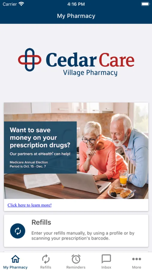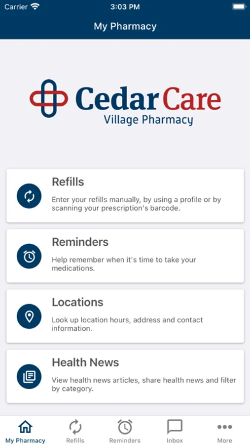 The Cedar Care Village Pharmacy app allows you and your family to securely communicate with your local pharmacy. Refill your prescriptions with one click, get refill reminders, get discounts at your local pharmacy and access Pharmacist written pages that help you understand your condition or medications.