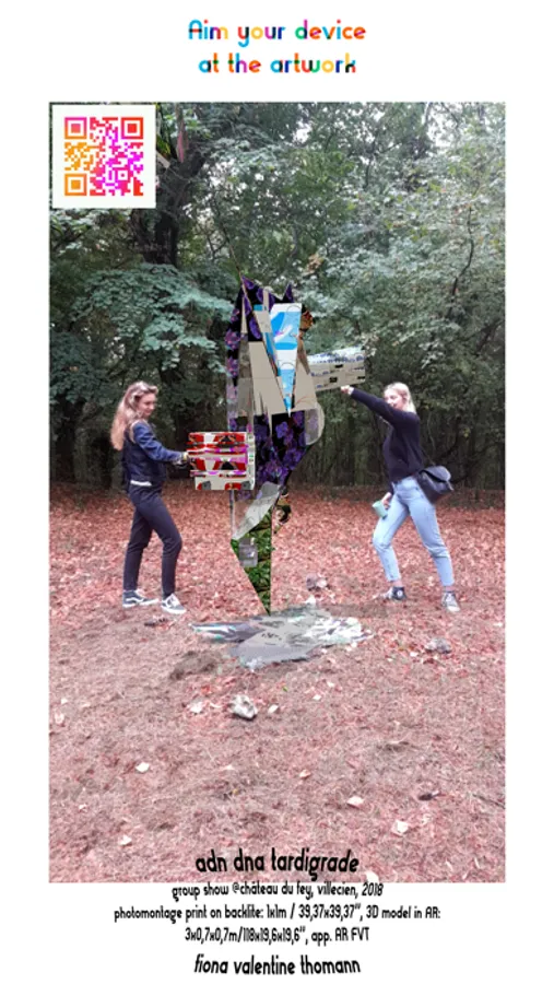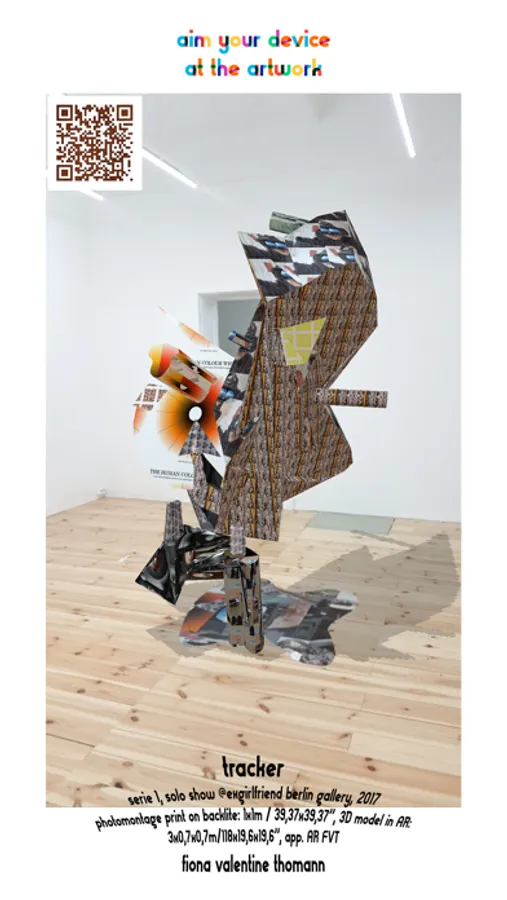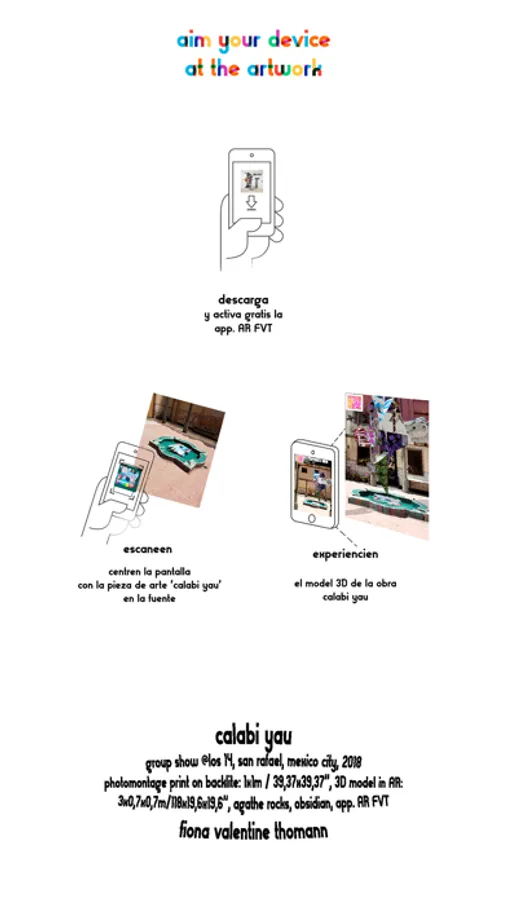 You can access the augmented reality art with the AR FVT app by aiming your device at Fiona Valentine Thomann’s artworks. Once an artwork appears in AR, you can scale it and reduce it, make it rotate 360°, and pass through it with your smartphone.